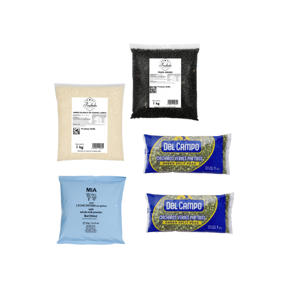 Leche entera en polvo + Arroz blanco de grano largo + Frijol negro + Chicharos verdes partidos