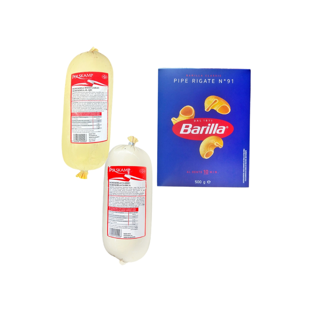 Pasta pipe rigate No. 91 + Mortadela clásica + Mortadella al ajo