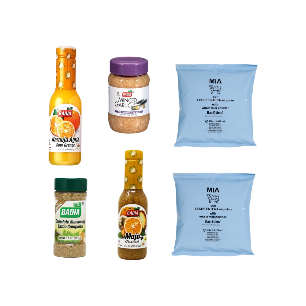 Sazón completo + Adobo de mojo marinado + Naranja agria + Ajo finamente picado + Leche entera en polvo