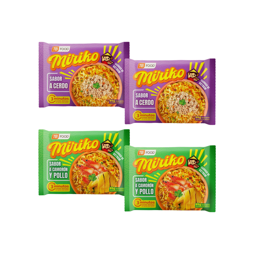 Sopa instantánea de fideos sabor a cerdo Miriko + Sopa instantánea de fideos sabor a camarón y pollo Miriko