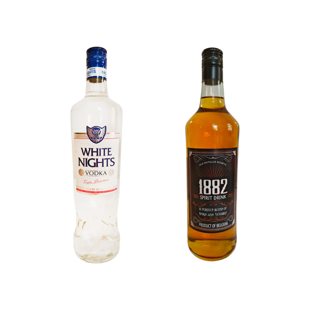 Vodka 37.5 % vol White Nights (1 L) + Whisky 40 % vol selección premium 1882 (1 L)