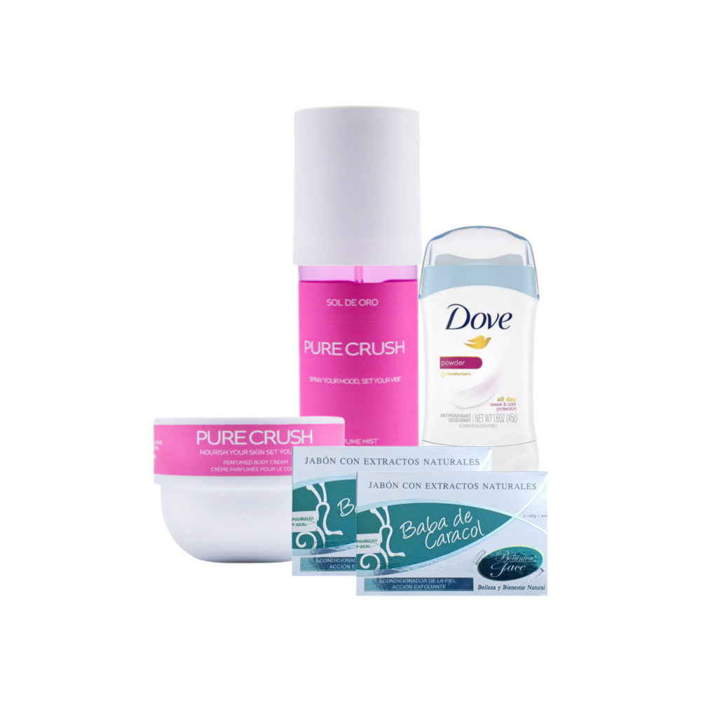 Combo Amor Platónico: Desodorante antitranspirante en barra powder Dove + Jabón con extracto natural de baba de caracol + Bruma de perfume amor platónico Sol de Oro + Crema corporal perfumada amor platónico Sol de Oro