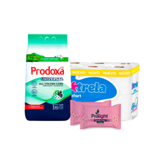 Combo básico del hogar #3: Detergente en polvo Prodoxa + Papel sanitario Extrela + Jabón de belleza con fragancia a orquídea Prolight