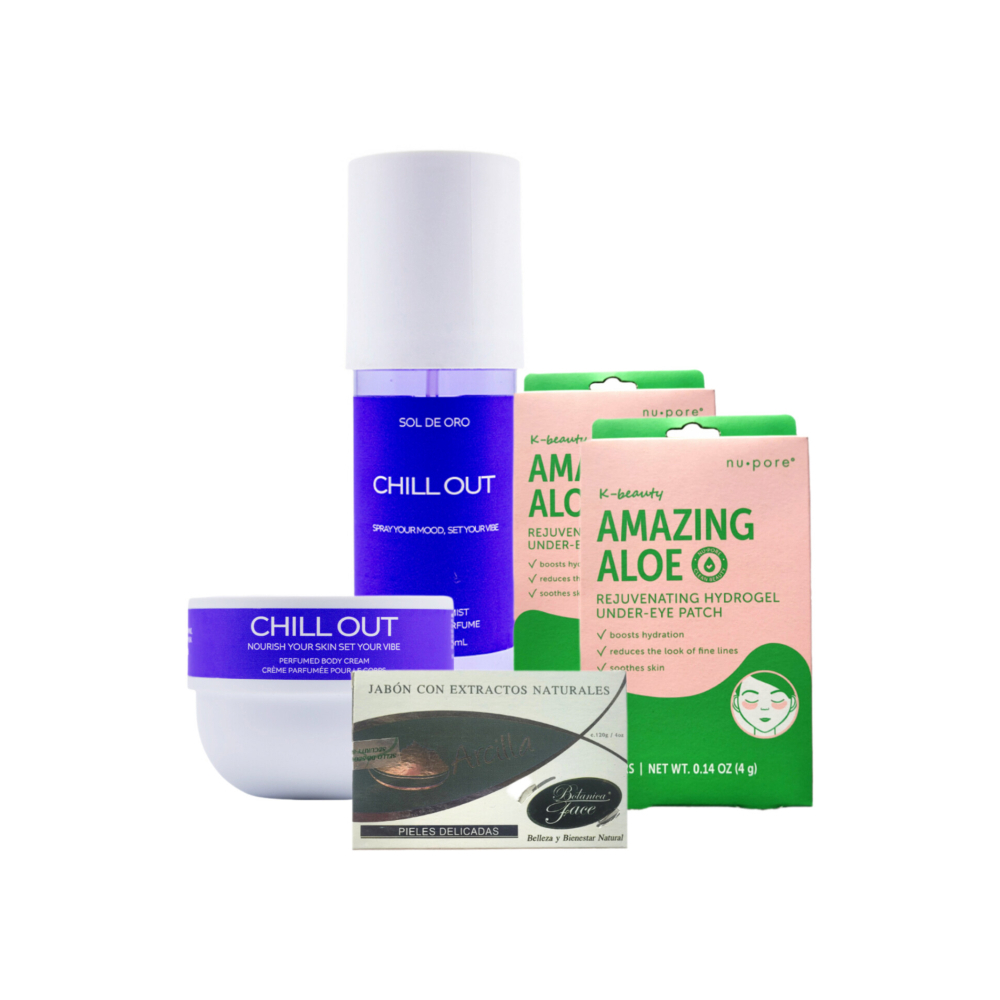 Combo Rejuvenecedor: Crema corporal perfumada relajante Sol de Oro + Bruma de perfume relajante Sol de Oro + Jabón con extracto natural de arcilla + Parche rejuvenecedor de hidrogel debajo de los ojos