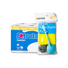 Combo de limpieza #7: Papel sanitario Extrela Confort + Paquete de esponjas, estropajos y cepillo para fregar Marwa