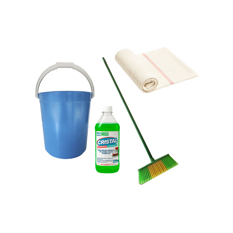 Cubo plástico + Detergente lavavajillas + Escoba de plástico con palo de madera forrado + Frazada de piso tradicional 60 cm x 80 cm