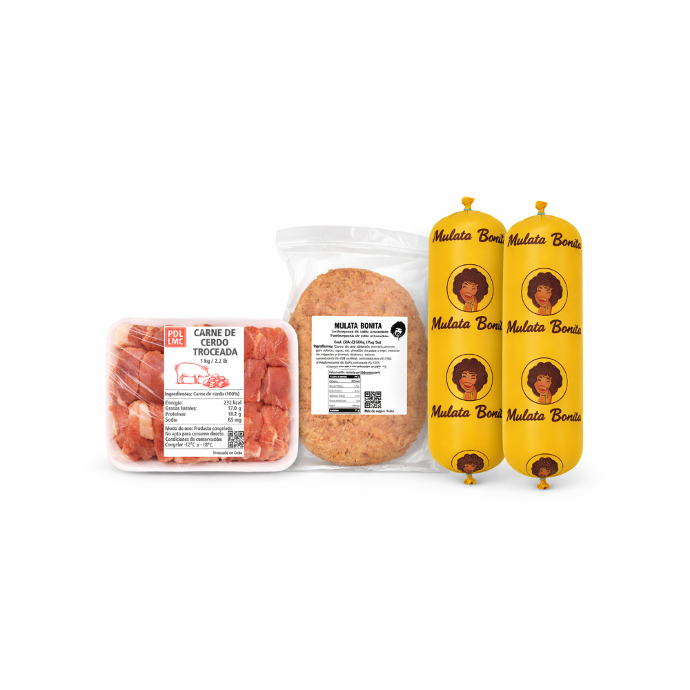 Carne de cerdo troceda + Picadillo condimentado de pollo + Hamburguesa de pollo precocinada