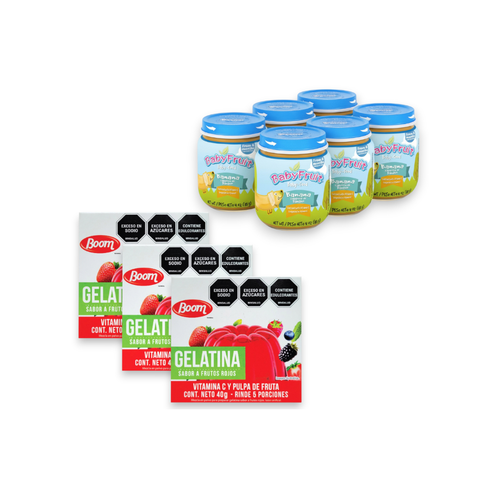Compota de banano Baby Fruit + Gelatina sabor frutos rojos Boom