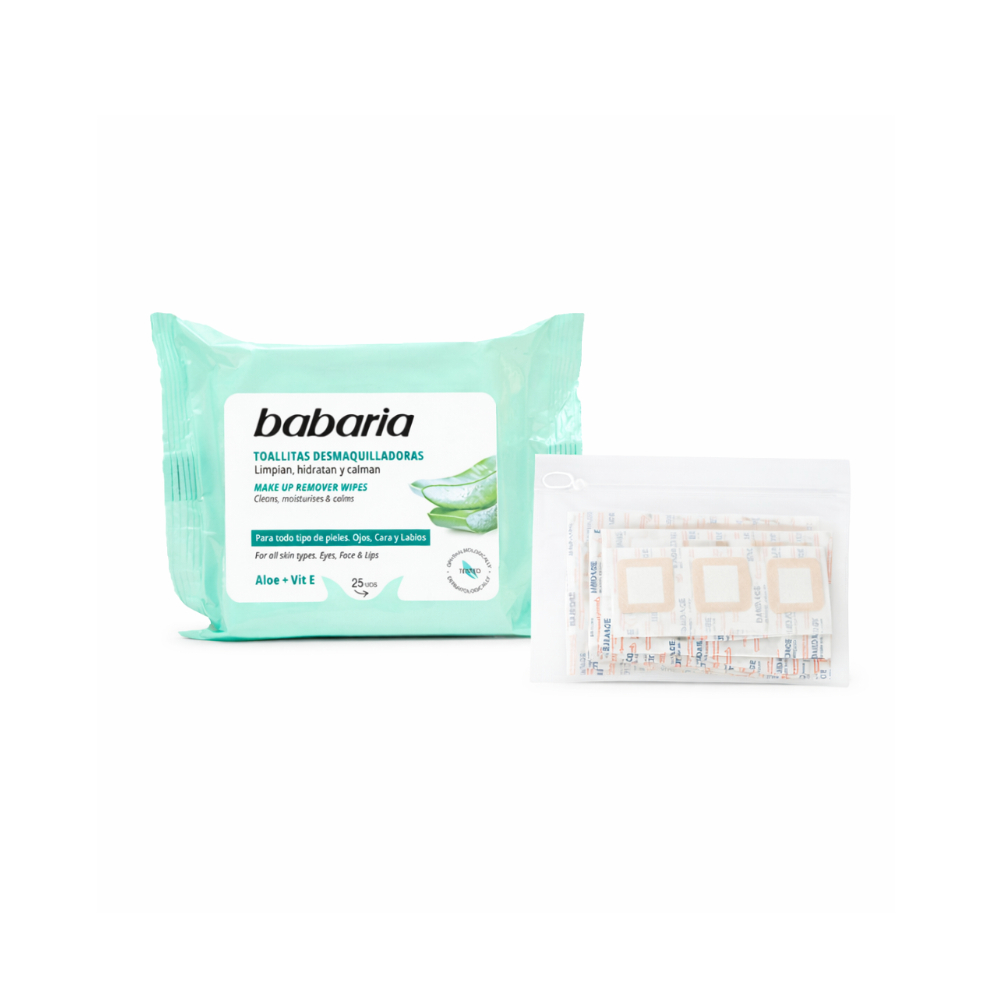 Tirita de primeros auxilios a prueba de agua antibacterianas Jinhua Jingdi Medical Supplies (100 U) + Toallitas húmedas desmaquilladoras aloe+vit E Babaria (25 U)