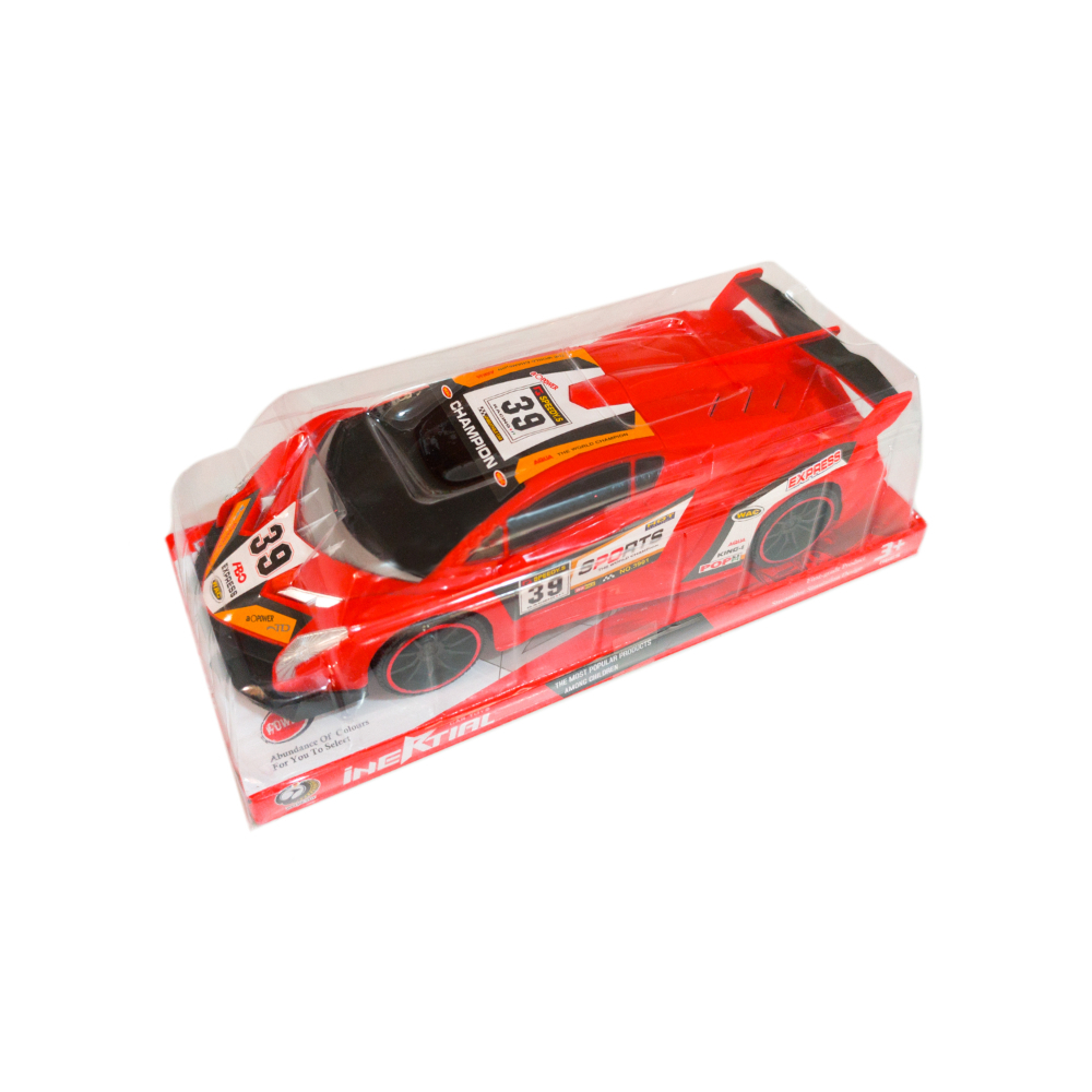 Coche de juguete simulando un coche real de carrera, con un nivel de detalles y colores llamativos en tonos rojo, azul o naranja según disponibilidad, pensado para niños mayores de 3 años.