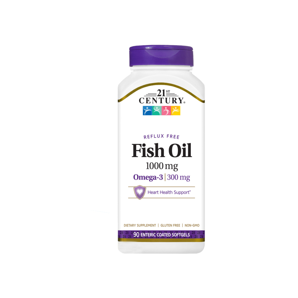 Omega 3. Aceite de pescado libre de reflujo 1000 mg 21st Century (90 cápsulas)