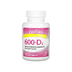 Suplemento de Calcio 600 mg + Vitamina D3 20 mcg 21st Century (75 tabletas)