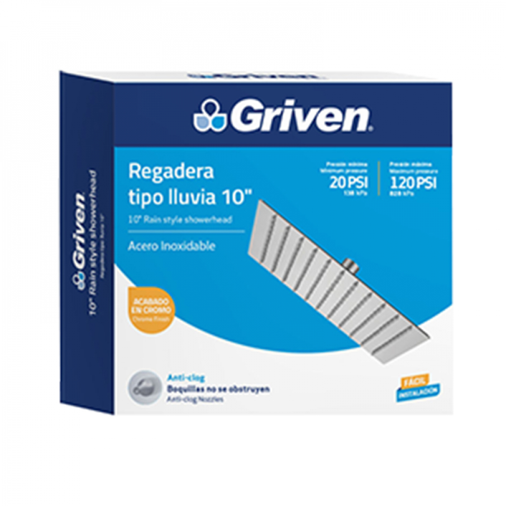 Regadera -ducha- cuadrada de 10" tipo lluvia acabado en cromo Griven