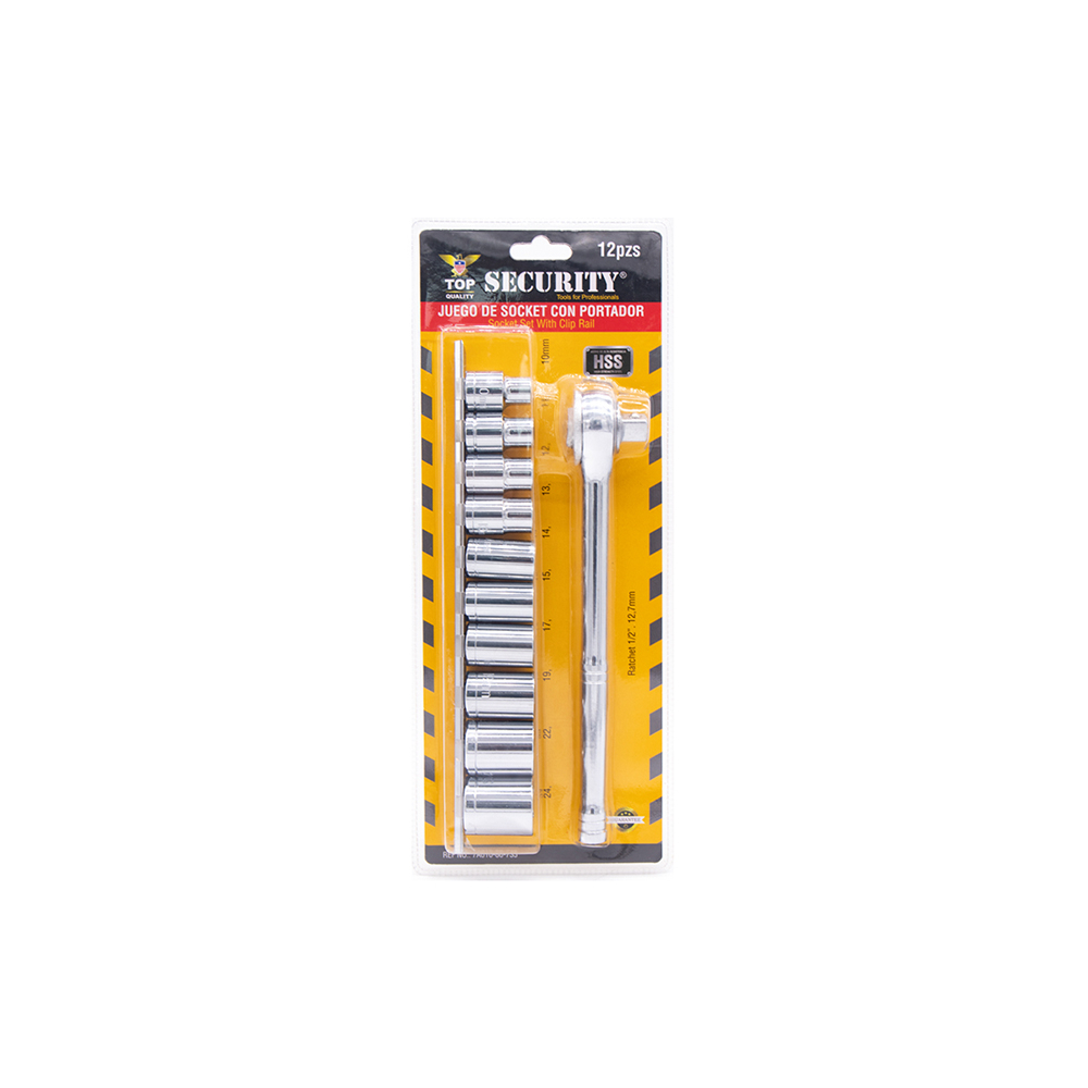 Juego de dados (cubos) de 12 piezas con ratchet de 1/2". Fabricado en acero reforzado con terminación cromada.