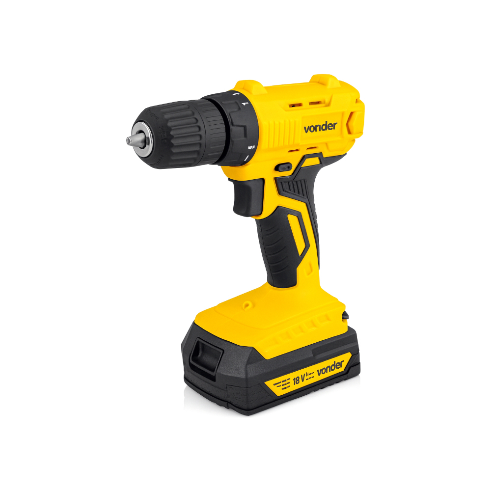 Taladro atornillador inalámbrico que acompaña maletín, batería de 18 V – 2 Ah, cargador bivolt automático y una punta doble. Utiliza batería intercambiable Vonder, compatible con herramientas identificadas con la letra I o con el sello “Batería Intercambiable Vonder”. Es ligero, práctico y portátil. Posee 19 posiciones de torque y 1 posición para perforación, adaptándose a diferentes materiales. Incluye luz LED para mejorar la visibilidad y mango revestido en goma para mayor comodidad del operador. Cuenta con mandril de apriete rápido que permite cambios rápidos de accesorios. Indicada para apretar y aflojar tornillos y para perforar madera o metal. No indicada para concreto.