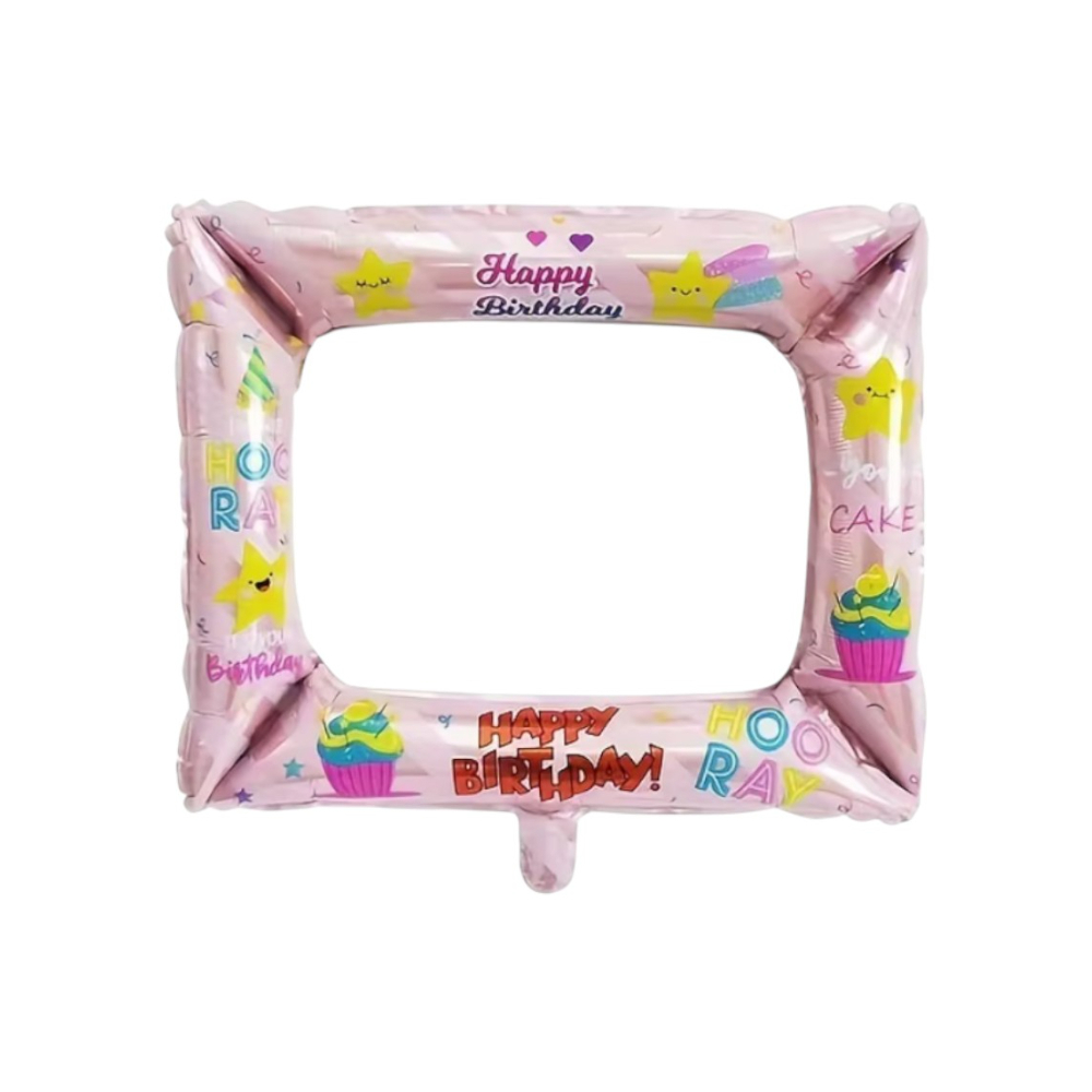 Globo para decoración de cumpleaños en forma de marco de foto familiar color rosado con cartel de Happy birthday