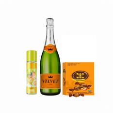 Combo día de las madres: Sidra Velvet (750 ml / 25.3 oz fl) + Colonia Fruity Symphony V.V.Love (220 ml) + Caja de bombones de oblea rellenos de chocolate Bon o Bon Arcor (450 g / 15.87 oz)