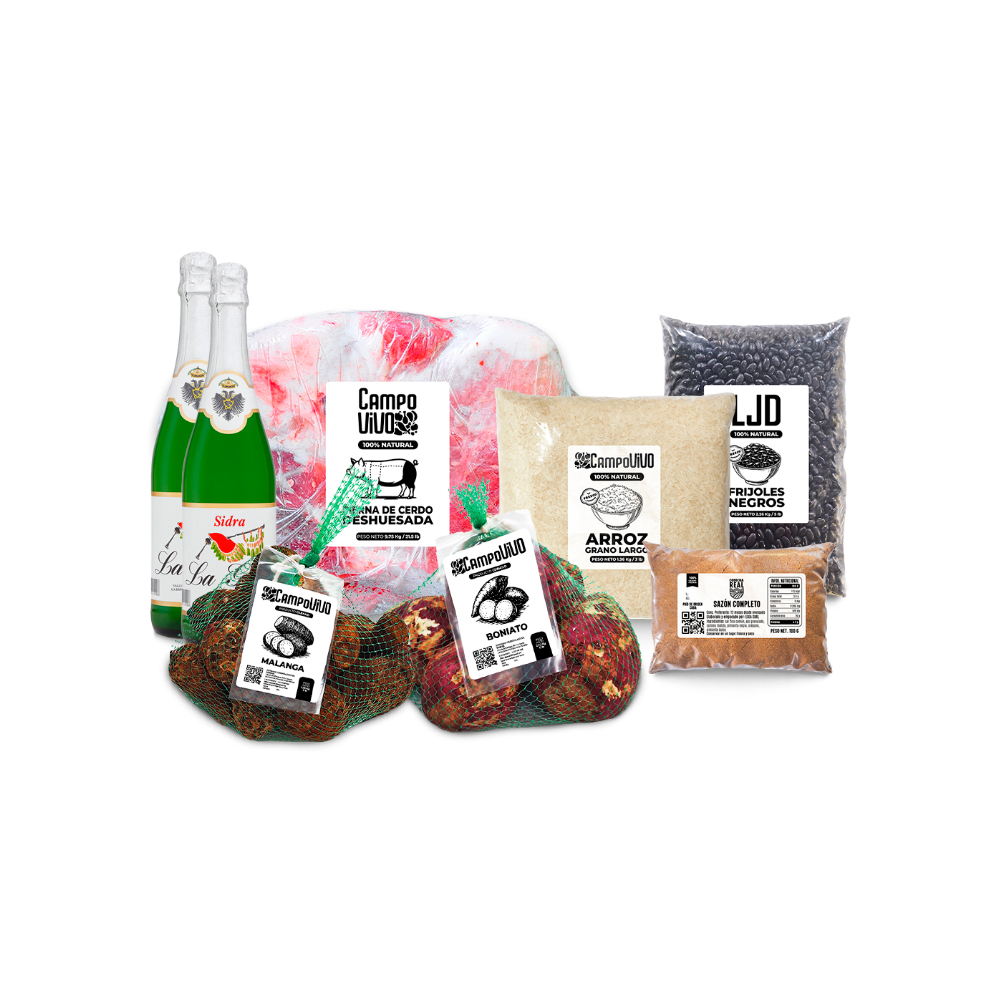 Combo navideño: Sidra La Gaita + Frijoles negros + Arroz de grano largo + Pierna de cerdo deshuesada + Malanga + Boniato + Sazón completo