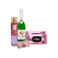 Combo para enamorados: Toallitas húmedas Doxa Romance + Sidra La Gaita + Colonia corporal en spray para mujer Charm Ripples + Jabón de belleza con fragancia rosas Prolight
