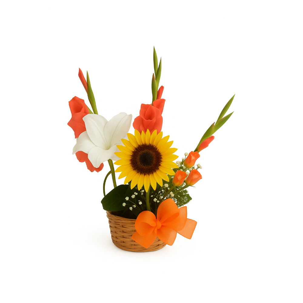 Cestica de mimbre, con flores variadas, gladiolos, lirios, rosas, girasol. Con una cinta en forma de lazo y una espiga decorativa en forma de corazoncito.