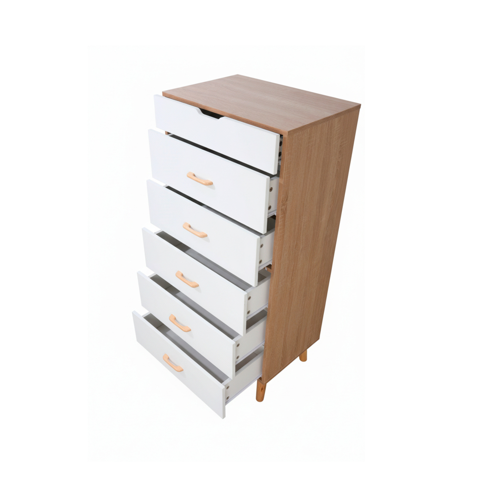 Este gavetero combina funcionalidad y estilo en un diseño compacto. Dispone de 6 gavetas, ofreciendo una solución de almacenamiento versátil, ideal para mantener todo en orden. Los cajones cuentan con guías correderas metálicas que aseguran un deslizamiento suave, mientras que las patas incorporan topes anti-ruido y anti-rayado para proteger el suelo.