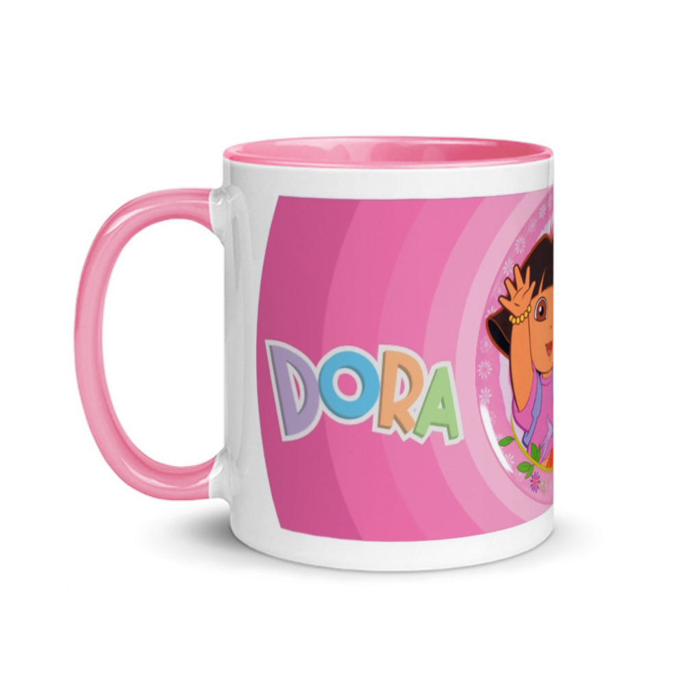 Jarra blanca y rosada de cerámica con asa redonda y diseño impreso, tema: Dora la exploradora