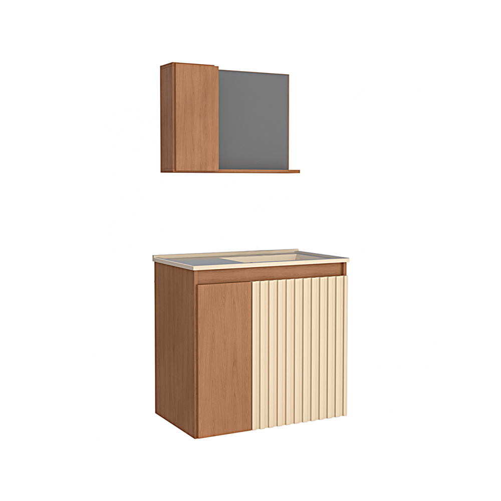 El baño de madera Camomila de Cozimax incorpora la tendencia de acabado en lamas a su línea completa de kits. Además de la puerta en lamas, con un revestimiento para un mejor acabado y durabilidad, también incluye una repisa interior, un lavabo en color arena, un cajón interior con guía telescópica y un espejo con mueble y repisa.